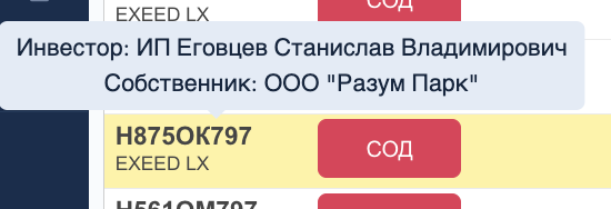Первый столбец содержит информацию об автомобиле. По клику на клетку первого столбца госномер авто будет скопирован в буфер обмена, информацию об инвесторе и собственнике можно найти во всплывающей подсказке.